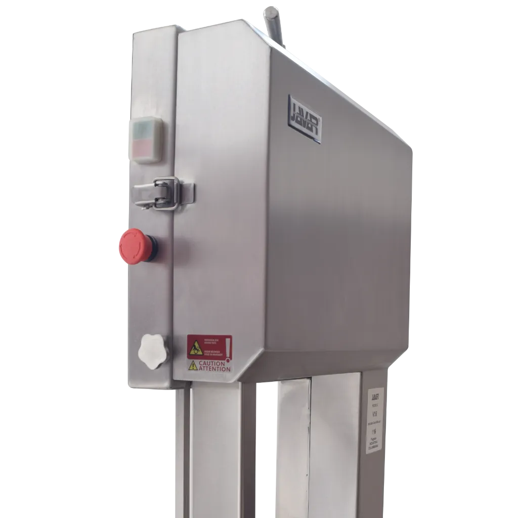 Sierra para corte de carne con hueso o carne congelada marca JAVAR línea PROFESSIONAL. Modelo eléctrico de piso para uso continuo, ideal para carnicerías grandes, supermercados y plantas de procesamiento. Puede procesar hasta 5 canales diarias (1000 kg/día). Estructura y volantes fabricados en acero inoxidable, material que cumple las actuales normas sanitarias (decretos 1500 y 3075). Altura de corte 41 cm, ancho de garganta 32 cm. Longitud de la cinta 116". Diámetro del volante 35 cm. Reductor de larga vida con piñones de acero en baño de aceite. Sensor de seguridad en la puerta y botón de paro de emergencia. Potencia 3 HP, tensión 220 Volt, 60 Hz, 3 fases. Dim 97x111xH182 cm, peso neto 160 kg. Origen: Colombia